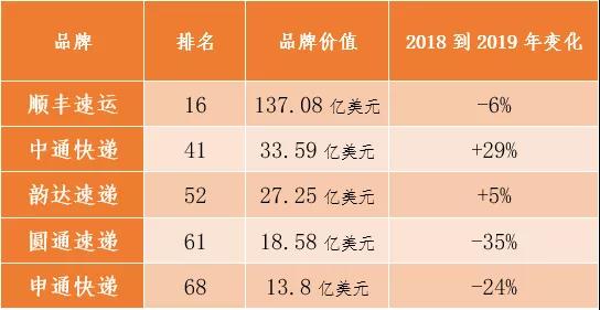 實際上,這已不是五家快遞企業第一次入圍這份榜單了,在去年發布的“BrandZ 2018最具價值中國品牌100強”中,五家企業就首次集體入圍,其中順豐速運排名第11、圓通速遞排名第36、韻達快遞排名第37、中通快遞排名第38、申通快遞排名第55。