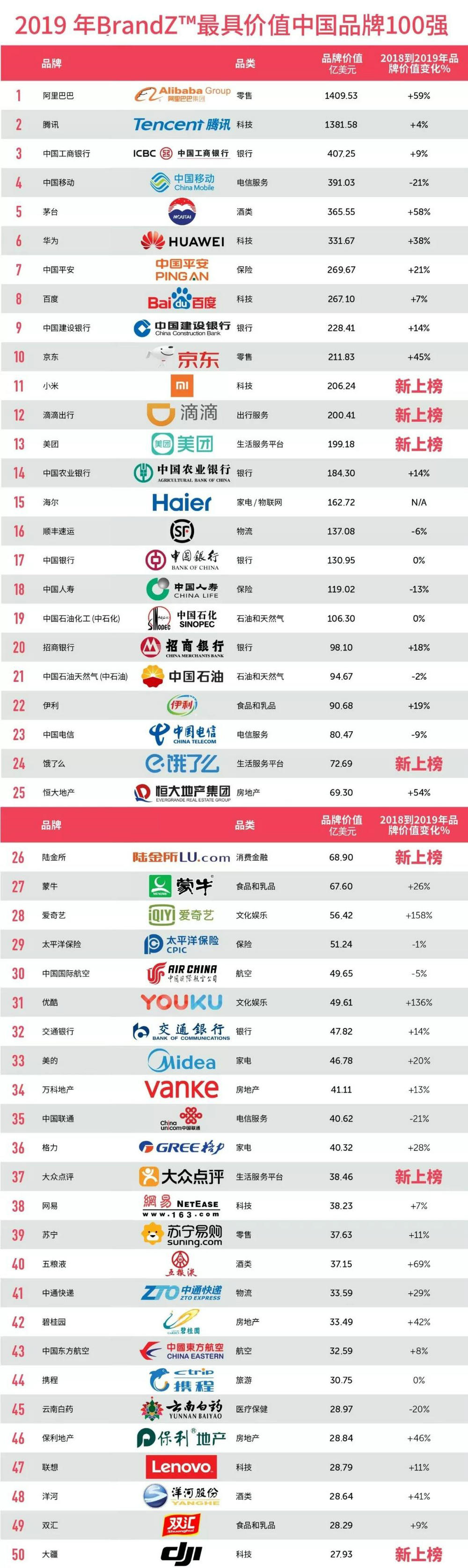 在與快遞相關的其他企業排名中,阿里巴巴首次榮膺榜首,其品牌價值同比增長59%,達到1410億美元。京東以211.83億美元排名第10。美團以199.18億美元,排名第13。蘇寧易購排名第39,品牌價值達37.63億美元。