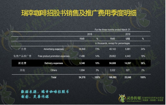 瑞幸咖啡招股書銷售及推廣費用季度明細顯示,過去一年開支大頭是廣告費(占據73%),也就是說,去年瑞幸在市場費用大多數落入了分眾傳媒的口袋;而2018年派送費僅占據總成本的10%。到了2019年Q1(1月至3月)瑞幸廣告播出量開始急劇降低,僅僅處于維持品牌記憶層面,但在派送費用上卻快速成為所有銷售及推廣的大頭、占據56%。