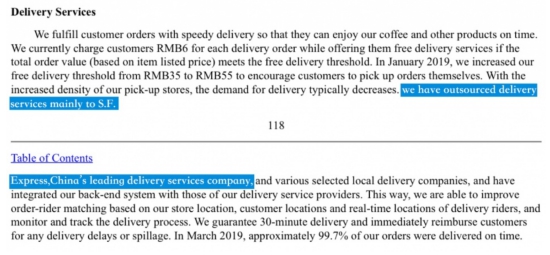 (▲瑞幸咖啡招股書顯示,“我們擁有卓越的配送服務,主要是由順豐快遞負責,而順豐是中國配送服務的領導公司”)