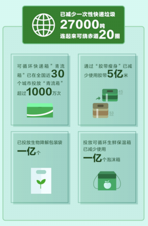 京東物流的可循環快遞箱“青流箱”已在全國近30個城市投放超1000萬次;生物降解包裝袋已投放超過1億個;并通過“膠帶瘦身”及可循環生鮮保溫箱等等環保措施共減少一次性快遞垃圾2.7萬噸,連起來可繞赤道20圈。
