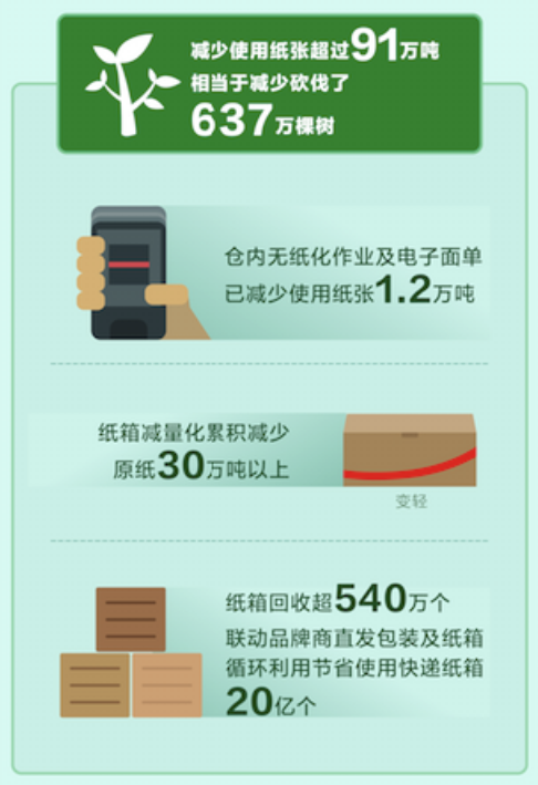 此外,京東物流也通過倉內無紙化作業、電子面單、紙箱無紙化等措施減少原紙使用,據京東物流統計,紙箱回收截止目前已超540萬個,聯動品牌商直發包裝及紙箱循環利用已節省使用快遞紙箱20億個。種種措施共減少使用紙張超過91萬噸,相當于減少砍伐了637萬顆樹。