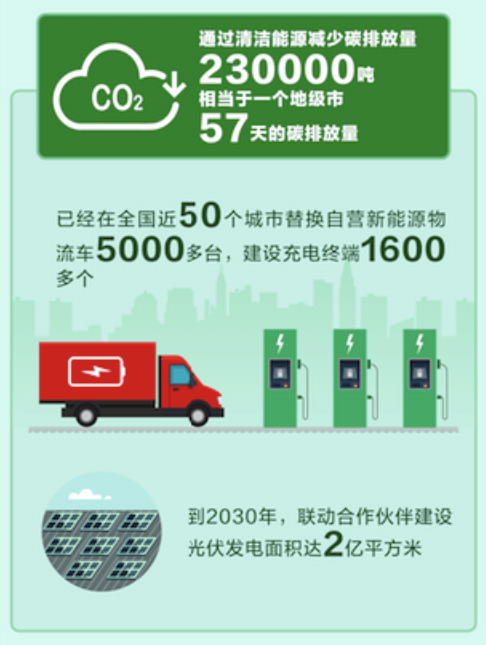 自推行“青流計劃”以來,京東物流已經在全國近50個城市替換自營新能源物流車5000多臺,建設充電終端1600多個。建造國內倉儲分布式光伏系統,通過使用清潔能源從而減少了碳排放23萬噸,相當于一個地級市57天的碳排放量。