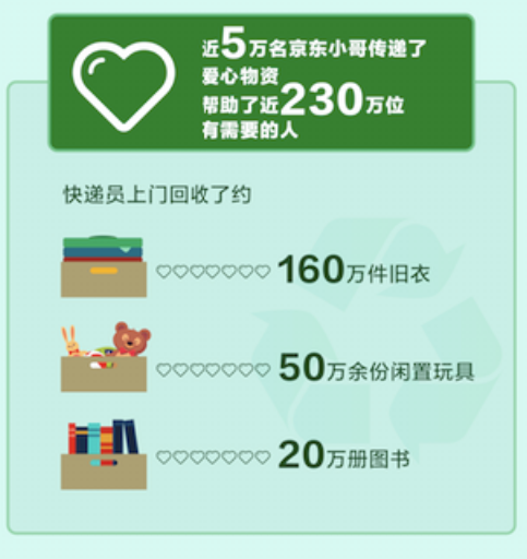 在環保的同時,京東的快遞員還上門回收了約160萬件舊衣,50萬余份閑置玩具以及20萬冊圖書。這期間,近5萬名京東快遞小哥傳遞過愛心物資,幫助了近230萬位有需要的人。