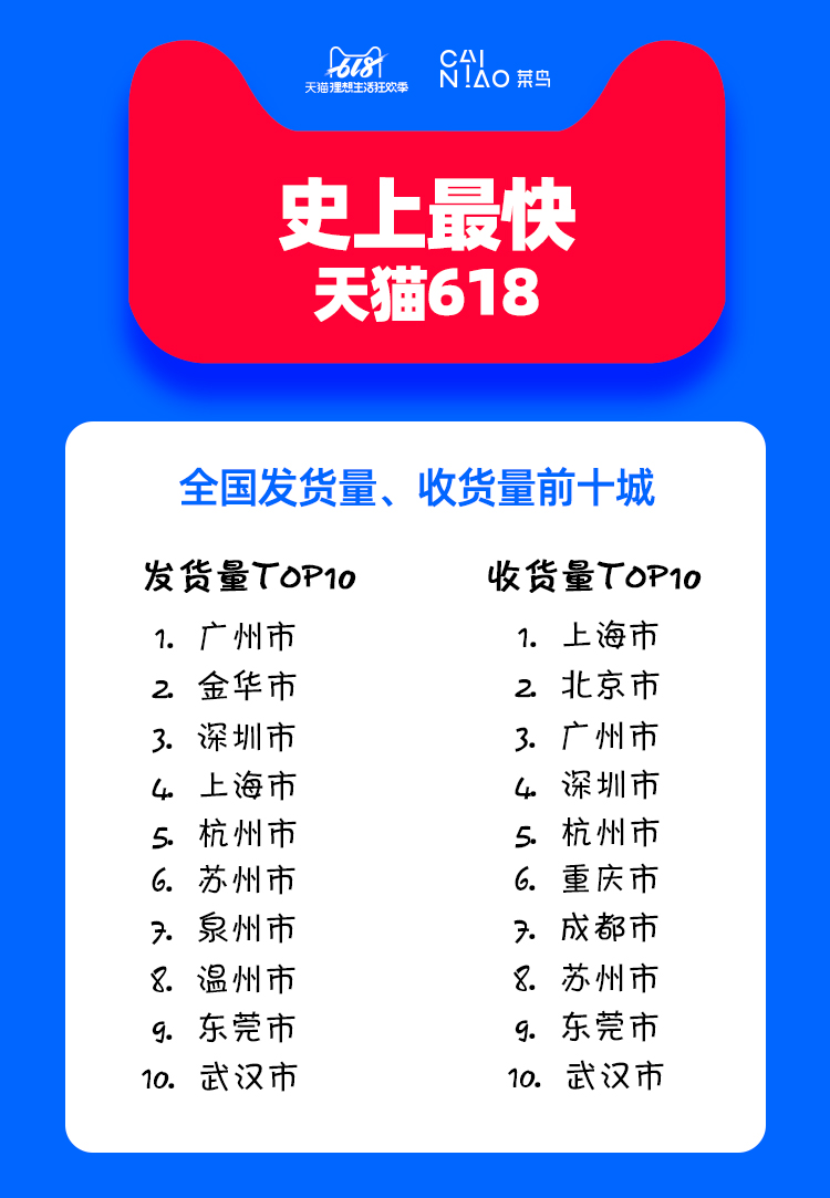 今年天貓618,產業帶集聚效應和大促爆發力日益顯現,物流保障成為中流砥柱。菜鳥發布的數據顯示:天貓618期間,全國發貨量最大的前十城中,廣東和浙江占據六席,廣州、金華、深圳位列前三甲。收貨量最大的十大城市中,北上廣深杭穩居前五,重慶、成都、蘇州、東莞、武漢躋身前十。