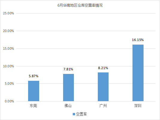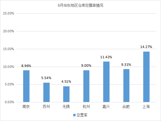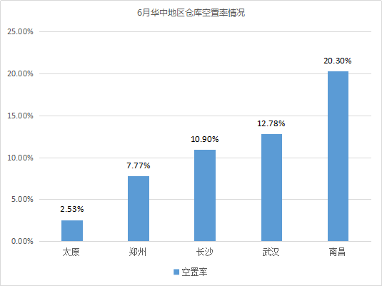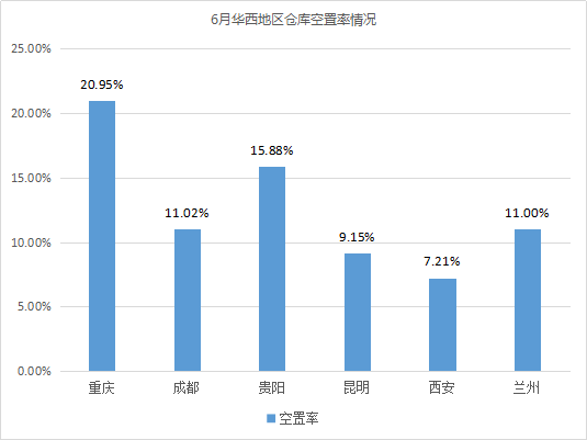 倉(cāng)庫(kù)空置率最高的城市為重慶、南昌,均超過(guò)20%。相較5月,重慶倉(cāng)庫(kù)空置率波動(dòng)不大;南昌由于有部分高標(biāo)庫(kù)投入市場(chǎng),如江西中江國(guó)際物流(約9萬(wàn)㎡)、南昌眾澤物流(1.2萬(wàn)㎡)、蘇寧物流基地倉(cāng)庫(kù)(超5萬(wàn)㎡)等,導(dǎo)致倉(cāng)庫(kù)空置率有所上漲,漲幅為7.05%。