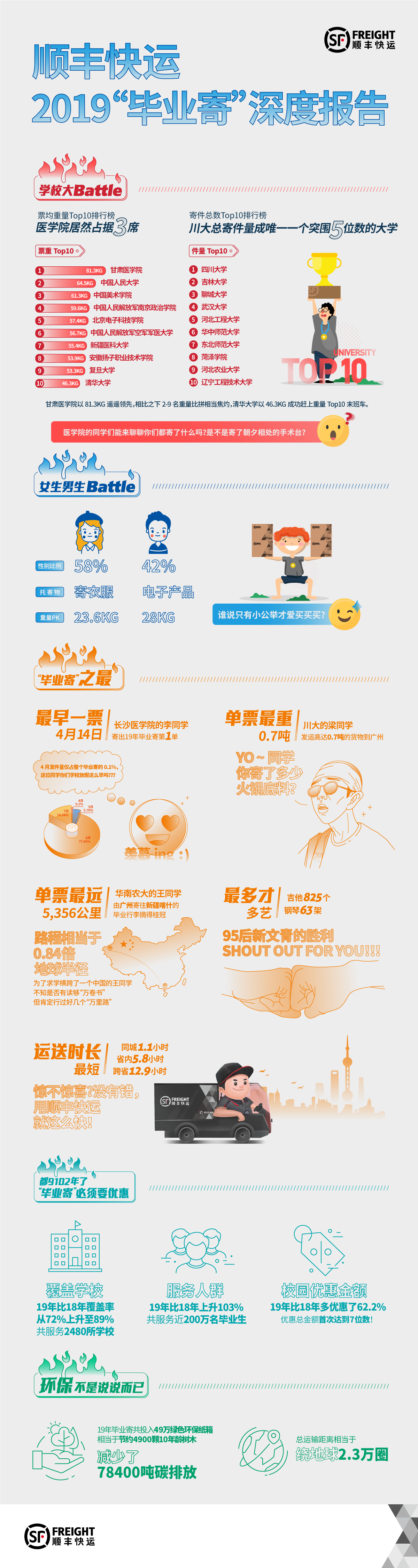 近日,順豐快運對此次活動進行了大數據分析并發布了《順豐快運:2019大學生“畢業寄”深度報告》。報告顯示,順豐快運2019年度“畢業寄”活動在4個月時間內共服務高校2480所,覆蓋了全國89%的高校。服務畢業生近200萬名,比18年同期增長了103%。同時,優惠總金額也達到7位數,比去年增加62.2%,運輸總里程數加起來可繞地球2.3萬圈。