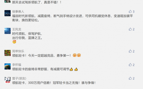 在方得網(wǎng)組織的藍(lán)牌輕卡投票活動(dòng)中,用戶也是在文章下紛紛留言,對(duì)領(lǐng)航輕卡充滿信賴。