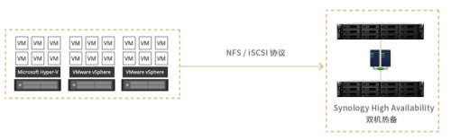 通過群暉高可用方案Synology High Availability(SHA),將兩臺群暉NAS組成主被動集群架構,當偵測到iSCSI服務中斷時,主服務器會自動偵測轉移服務到第二臺服務器上,以保護整個虛擬機環境系統。