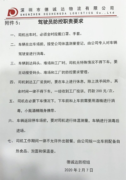 在司機出車期間,運可視為司機配備自熱食品等,要求司機在工廠、碼頭及堆場作業(yè)過程中全程保證在車輛中(除上洗手間等特殊情況外)不得下車,不直接接觸工廠和碼頭、堆場任何工作人員。