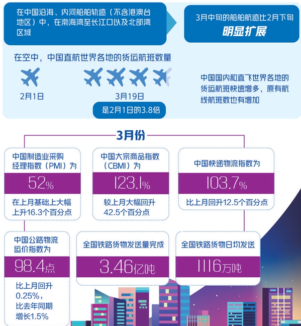 隨著我國統籌推進新冠肺炎疫情防控和經濟社會發展,疫情防控形勢持續向好,生產生活秩序穩步恢復。反映經濟運行態勢的一系列相關指標表明,盡管疫情給經濟社會運行帶來了擾動,但隨著復工復產推進,工業制造、交通物流等行業復工復產加快,經濟運行正加速向正常水平回歸。