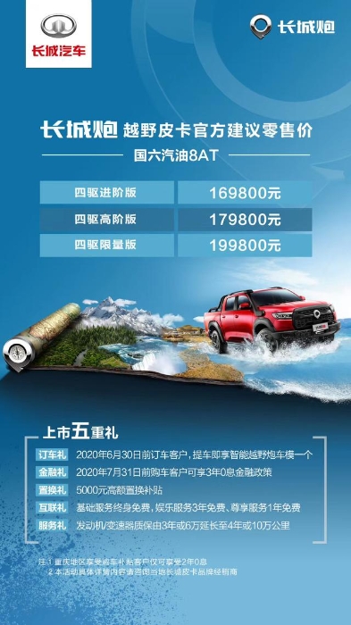 長城炮越野皮卡終于在6月5日正式上市,首期推出三款國六汽油8AT車型,其中四驅進階版16.98萬元,四驅高階版17.98萬元,四驅限量版19.98萬。另外,柴油版車型將于7月上市。