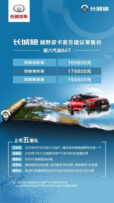 對(duì)了,最后的福利不要忘記,目前購(gòu)買長(zhǎng)城炮越野皮卡,可以享受非常有誠(chéng)意的“上市五重禮”,話不多說,趕緊野起來!