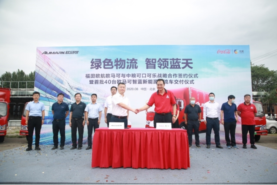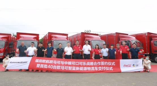 2020年8月31日,歐馬可智藍新能源物流車再次斬獲大單,歐航歐馬可向中糧可口可樂交付首批40臺歐馬可智藍新能源物流車,并簽訂戰略合作協議。福田汽車集團副總裁、歐航歐馬可事業部總裁顧德華,福田汽車集團業務副總裁、福田智藍新能源總裁秦志東,中糧可口可樂相關領導以及眾多行業媒體出席了本次交車儀式。
