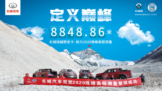 2020年12月8日,國家正式公布珠穆朗瑪峰最新高程——8848.86米。這標志著國家測量登山隊的2020珠峰高程測量任務圓滿完成。我們首先要向參加此次登山測量任務的攀登者致敬,是他們的勇氣與毅力讓五星紅旗再次閃耀地球之巔。作為本次任務的媒體官方工作用車,長城炮秉承科學精神和攀登者精神,全程高光表現,勇于擔當、無畏向前,以中國品牌實力保障國家任務圓滿成功。