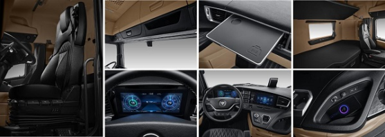 作為一款國際高端重卡,歐曼銀河的外觀和內飾同樣盡顯高端本色。外觀設計上,歐曼銀河前面罩格柵簡潔大氣,采用參數化“銀河星翼”的設計手法,網孔周圍采用鉆石切割型面環衛歐曼鉆石大標,網孔中配有光導條,點亮后宛若燦爛星河,美輪美奐。內飾方面總體來說可以用五個字概括:舒適且奢華。歐曼銀河告別傳統重卡內飾一貫的功能堆砌,采用布局流暢靈動的工作臺和類曲面貫通式12.3+10寸雙液晶大屏,四幅方向盤、PM2.5過濾空調系統、無線充電等功能讓“駕”、“乘”、“娛”等豪華體驗觸手可及。座椅采用“格拉默”最新一代座椅,可提供遠超C級轎車座椅的舒適性。