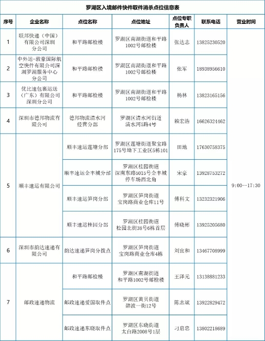 附表:羅湖區(qū)入境郵件快件取件消殺點(diǎn)位信息表