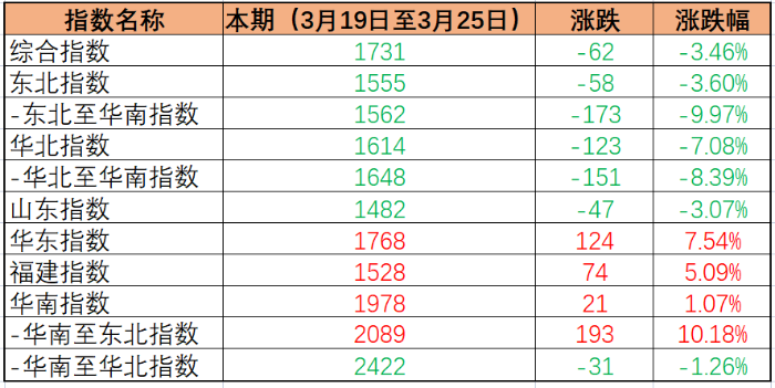 此外,山東指數(shù)報收1482點,環(huán)比下降47點,降幅3.07%;華東指數(shù)報收1768點,環(huán)比上漲124點,漲幅7.54%;福建指數(shù)報收1528點,環(huán)比上漲74點,漲幅5.09%。