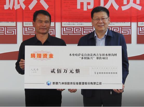 4月19日,“九洲恒昌·木壘縣鄉(xiāng)村振興幫扶捐贈”儀式暨民宿提升項目開工儀式在新疆木壘哈薩克自治縣西吉爾鎮(zhèn)水磨溝村村委會舉行。在捐贈儀式上,新疆九洲恒昌供應鏈管理股份有限公司副總經理姜秋野向水磨溝村捐贈“鄉(xiāng)村振興幫扶資金”200萬元,主要用于水磨溝村“感黨恩教育基地(村史館)”建設以及民宿提升改造項目。