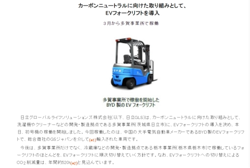 在開始運營當天,日立集團在官網發布了公告,并宣告今后不僅在多賀工廠,還將在櫪木工廠(冷庫車開發及生產基地)逐步引進電動叉車替代正在運行的汽油叉車的方針,這樣通過替換成電動叉車,預計每年可以減少約520噸二氧化碳的排放。