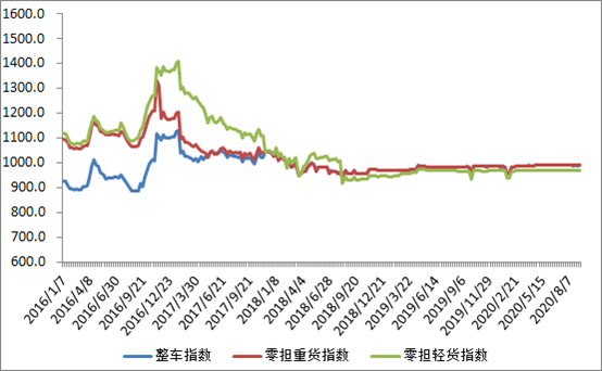 分車型看,各車型指數(shù)環(huán)比漲跌互現(xiàn)。其中,整車指數(shù)為989.82點(diǎn),比上周回升0.09%;零擔(dān)輕貨指數(shù)為968.38點(diǎn),比上周回落0.01%;零擔(dān)重貨指數(shù)為989.84點(diǎn),比上周回升0.08%。